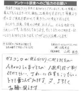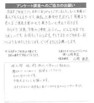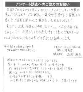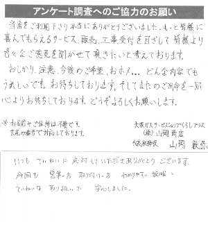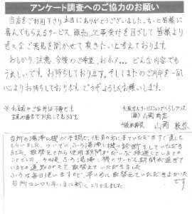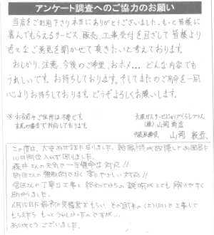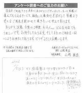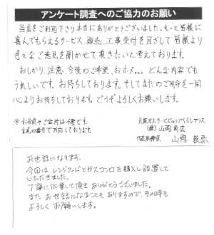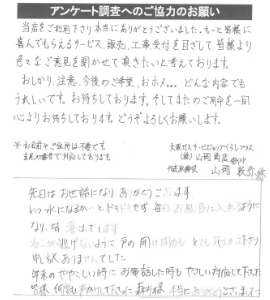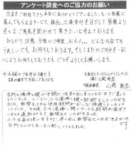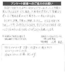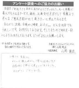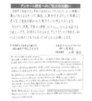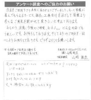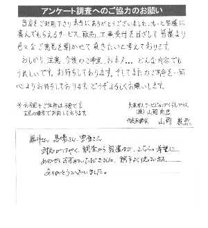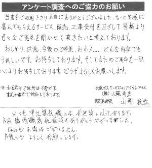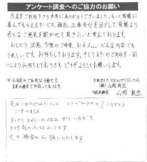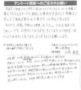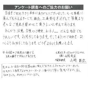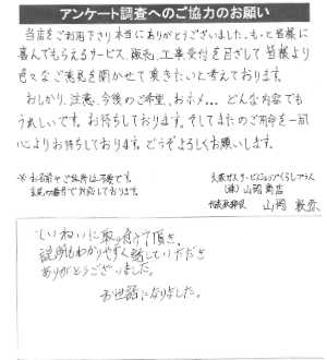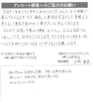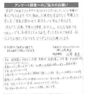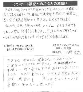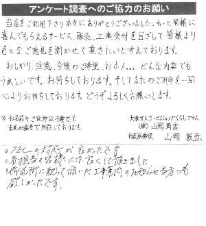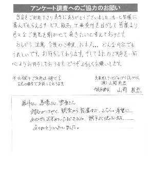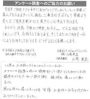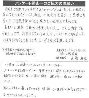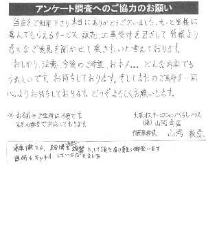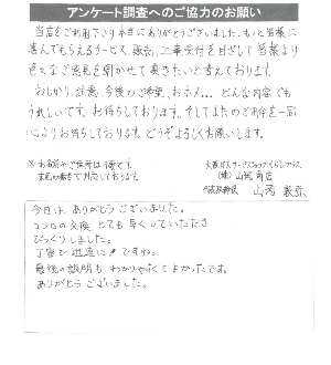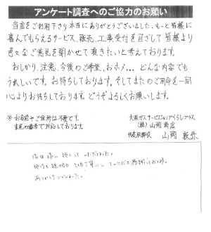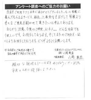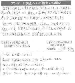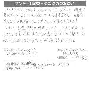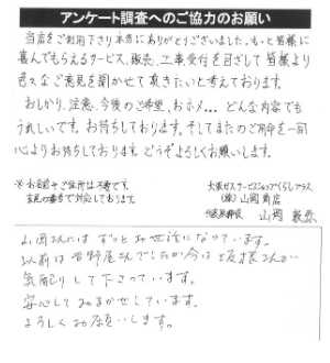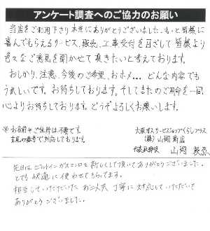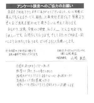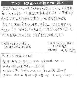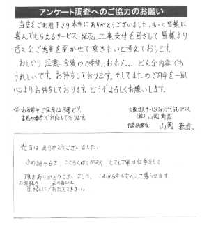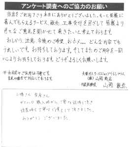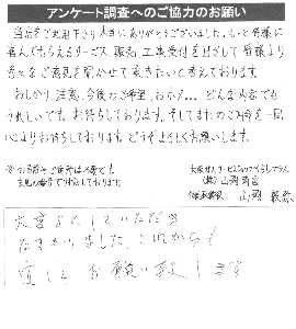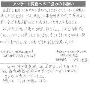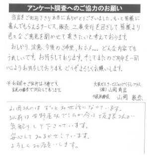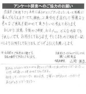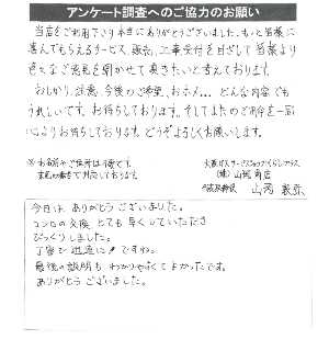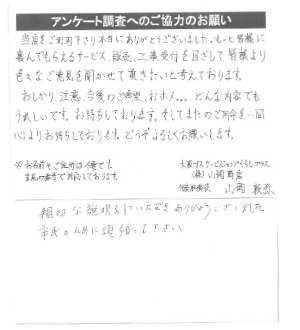 この様なアンケートはめったに答えませんが、感謝の気持ちをお伝えしたくて頑張りました。今度ともよろしくお願い致します。