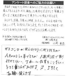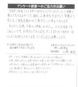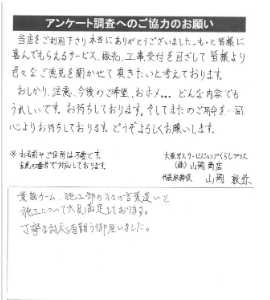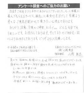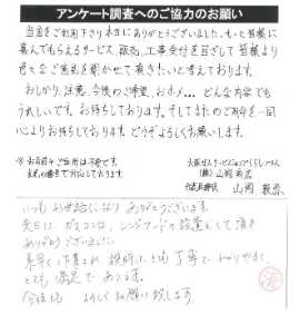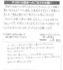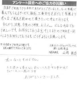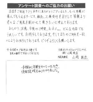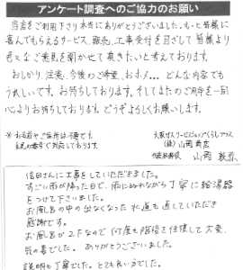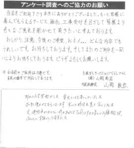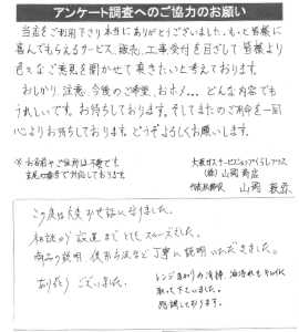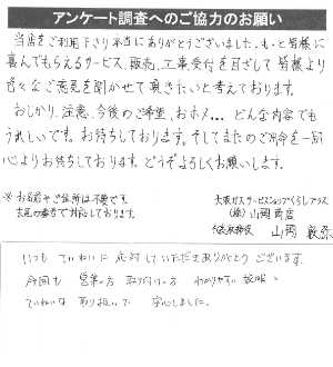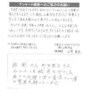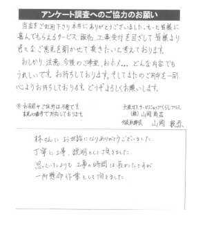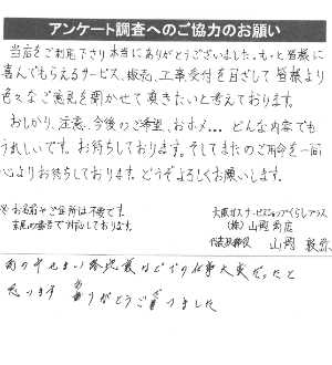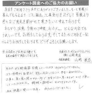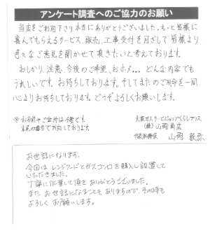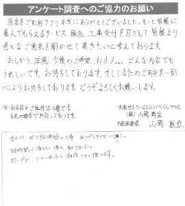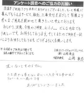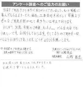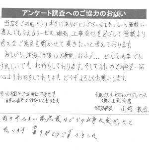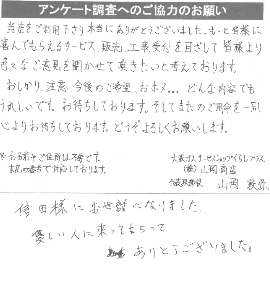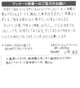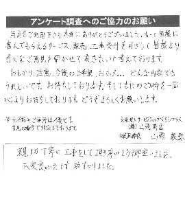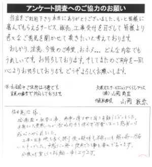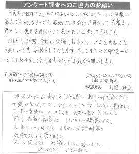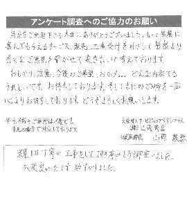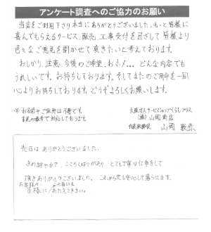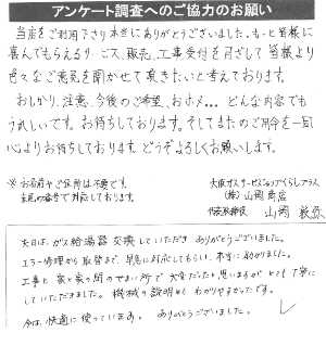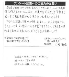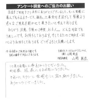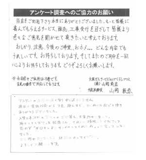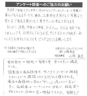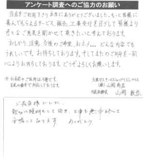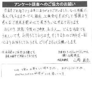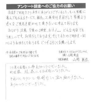 また当日、工事で来られた信田様も蒸し暑い浴室にもかかわらず、てきぱきと作業をされ、お聞きしていた時間よりも早く終了し、使用法の説明も丁寧にして下さいました。ありがとうございます。
